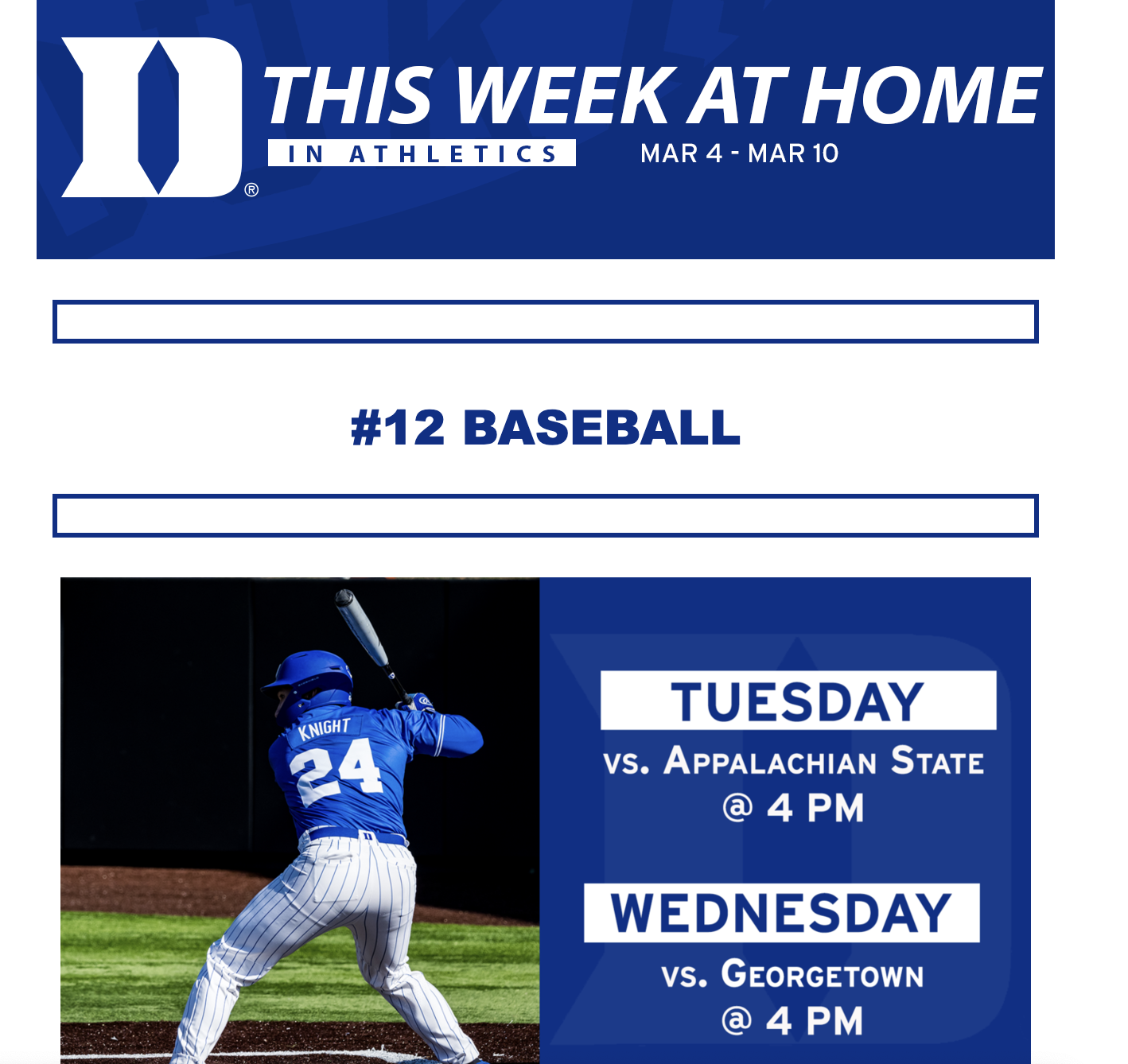 Each week, I designed a graphic that was distributed to over 30,000 Duke Athletics fans and students. The graphic included detailed information about upcoming sporting events and highlighted any marketing promotions associated with each game.